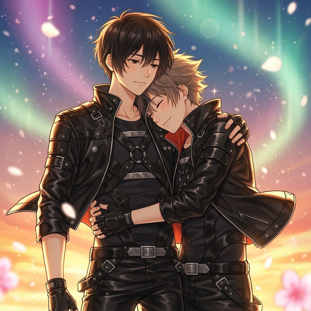 This image shows two young men wearing leather chest harnesses. The picture captures a modern and edgy aesthetic.