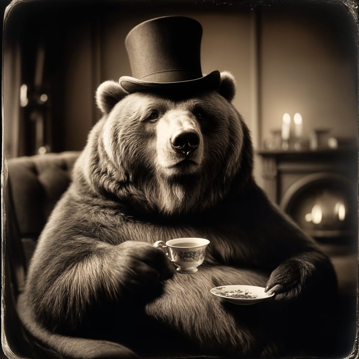 A sepia-toned tintype portrait of a bear enjoying tea. The dignified Kodiak, adorned with a top hat and monocle, is depicted in a vintage photographic style with rich textures.