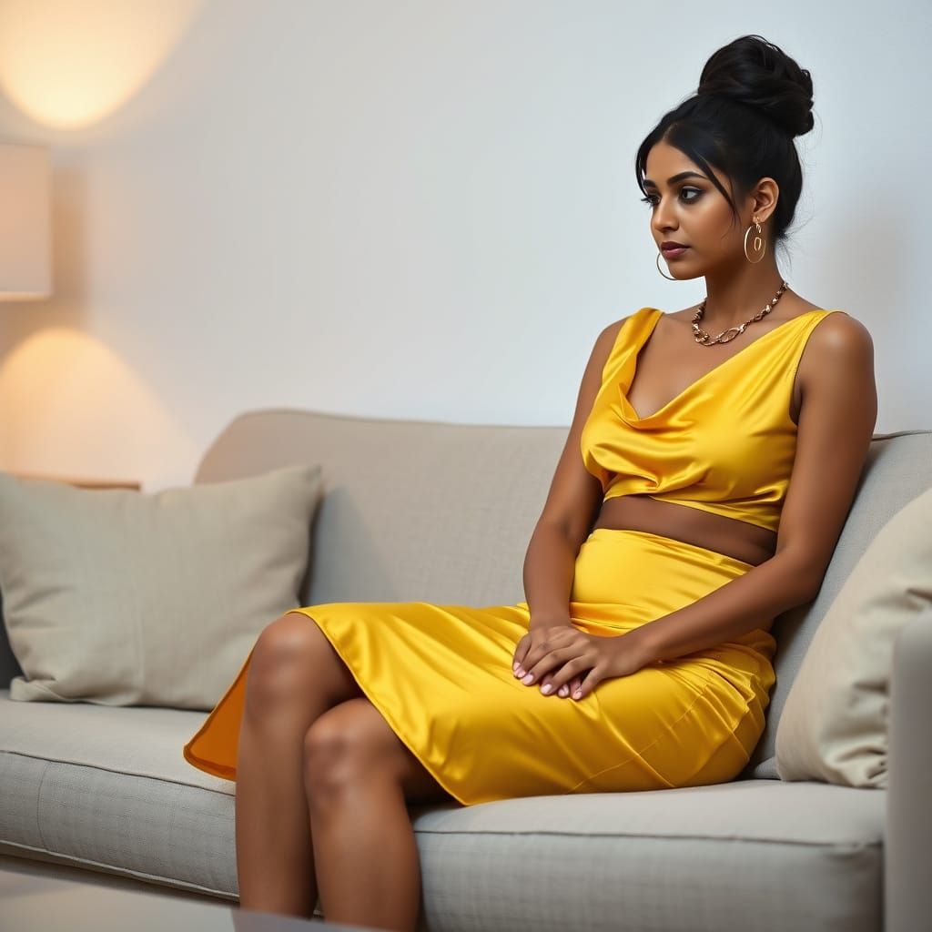 This image features a beautiful Indian woman in her late twenties, dressed in a striking yellow silky top and mini-skirt. She sits on a sofa, her hair styled in a bun, with a serious expression as she converses with a young man beside her.