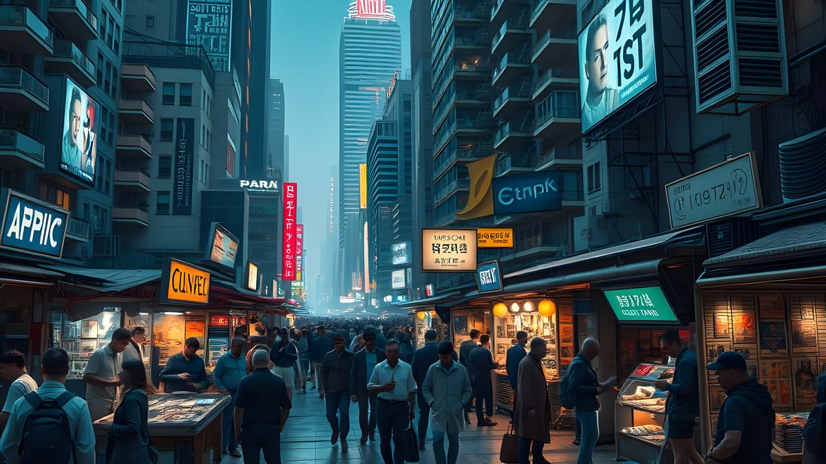 This image depicts a crowded street market in a futuristic city at night. The scene, reminiscent of cyberpunk 2099, features holographic ads, metal and plastic vending booths, and a diverse crowd in a cyberpunk aesthetic.