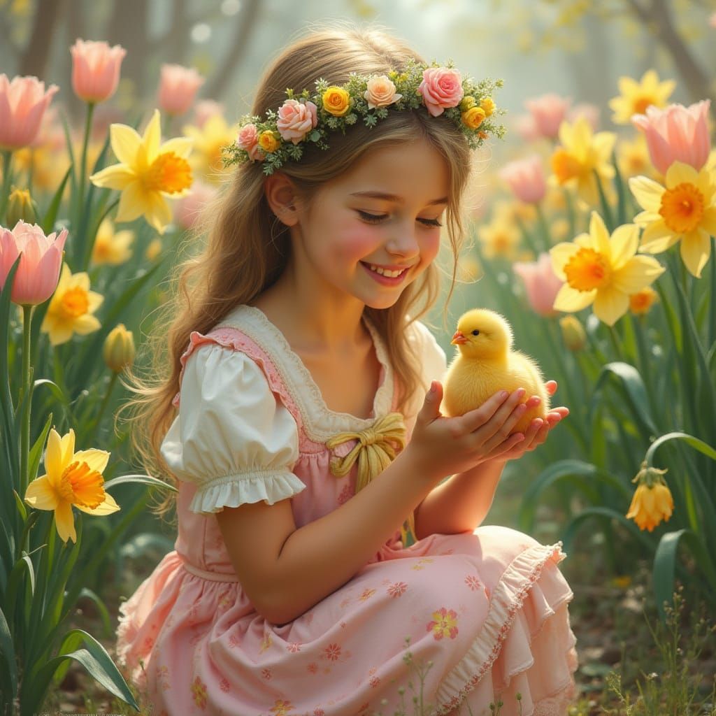 This image shows a delicate young girl in a traditional Easter princess outfit, surrounded by blooming flowers and soft brushstrokes, reminiscent of French Impressionist art from the late 19th century.