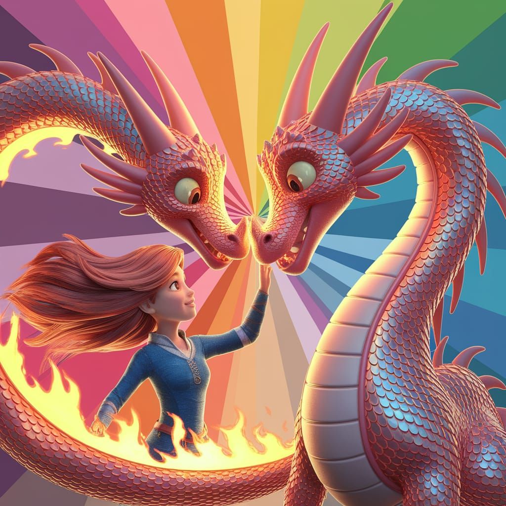 A vibrant 3D digital art image shows a heroine touching a friendly dragon's snout. Iridescent scales shimmer in warm hues, with magical fire casting a radiant light in this Pixar-inspired scene.