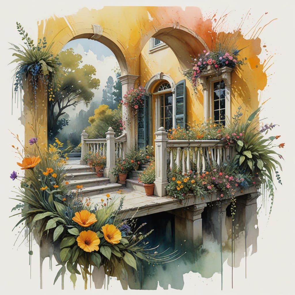 This serene outdoor scene features a beautifully adorned porch with arched windows, columns, and a balustrade, surrounded by a variety of colorful flowers in pots and hanging baskets. The image showcases a poetic and surreal celebration of nature's fleeting beauty, blending structure and spontaneity in a...