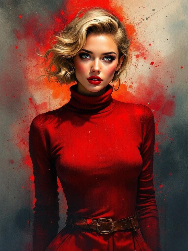 This image features a 1950s pin-up woman in a glowing crimson dress, rendered in a surreal watercolor fusion with atmospheric effects and striking light contrasts.