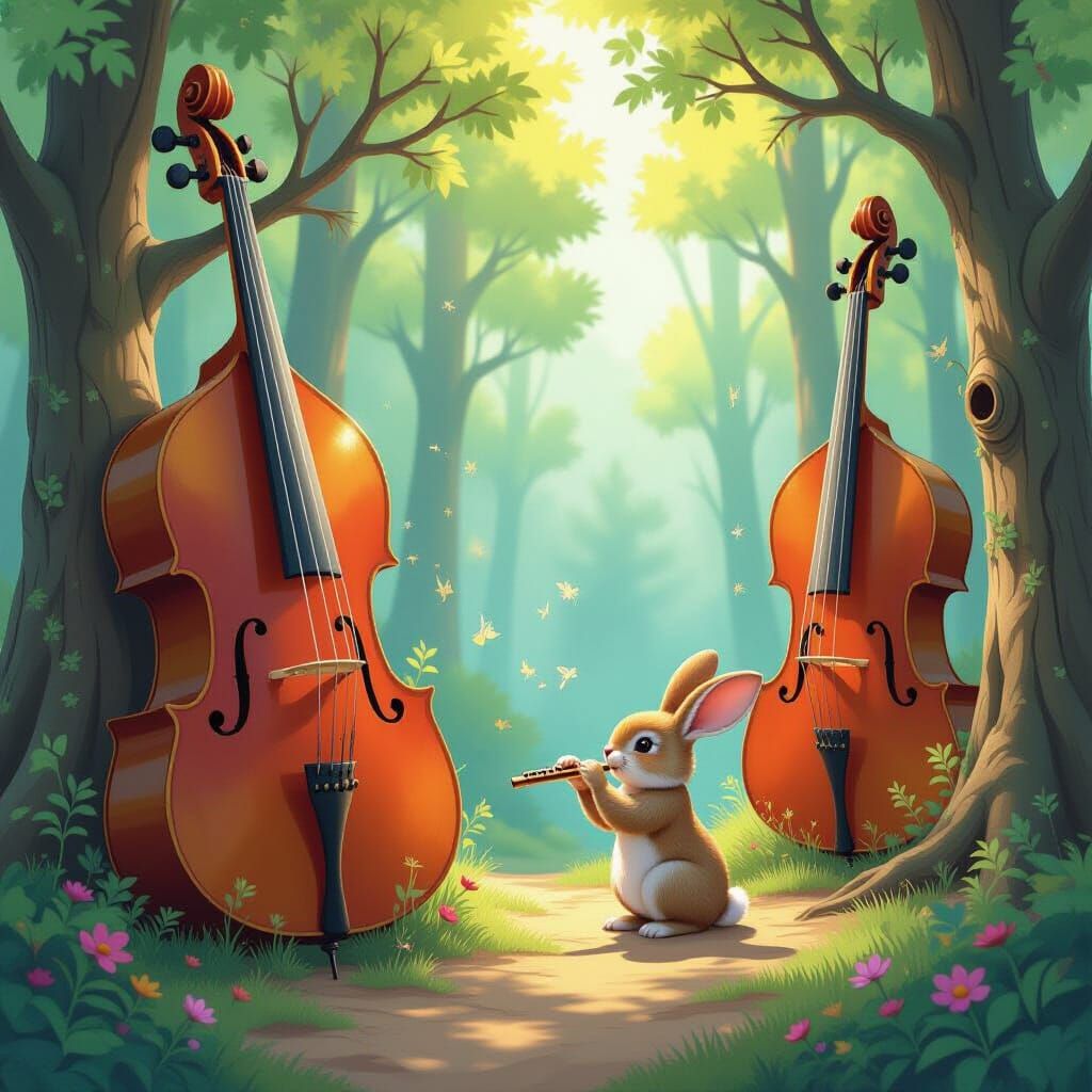 A whimsical forest scene with colossal musical instruments as trees. A small rabbit plays a branch-flute, rendered with fractal patterns and 3D shading in a soft gouache style.