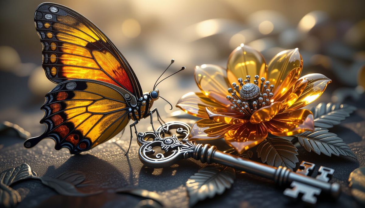 This image showcases a detailed, realistic rendering of a butterfly, mechanical flower, and ornate key. Crafted from patinated silver and amber yellow materials, it features cinematic lighting and a deep depth of field.