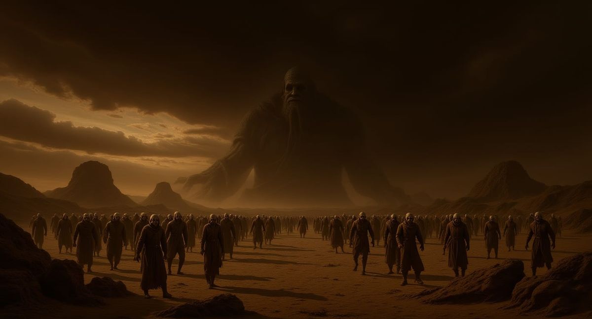 This image shows a ruined desert landscape filled with tormented souls under a stormy sky. Twisted rock formations and a colossal idol enhance the scene's atmosphere of doom, rendered with dramatic chiaroscuro.