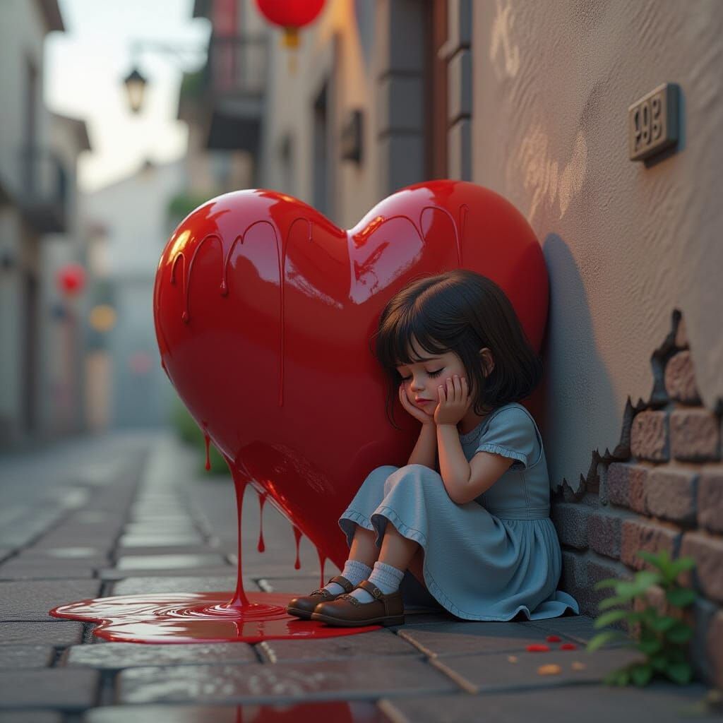 This image shows a sorrowful little girl inside a heart, leaning against a street wall. The artwork features deep colors and intricate details, rendered as fantasy concept art.