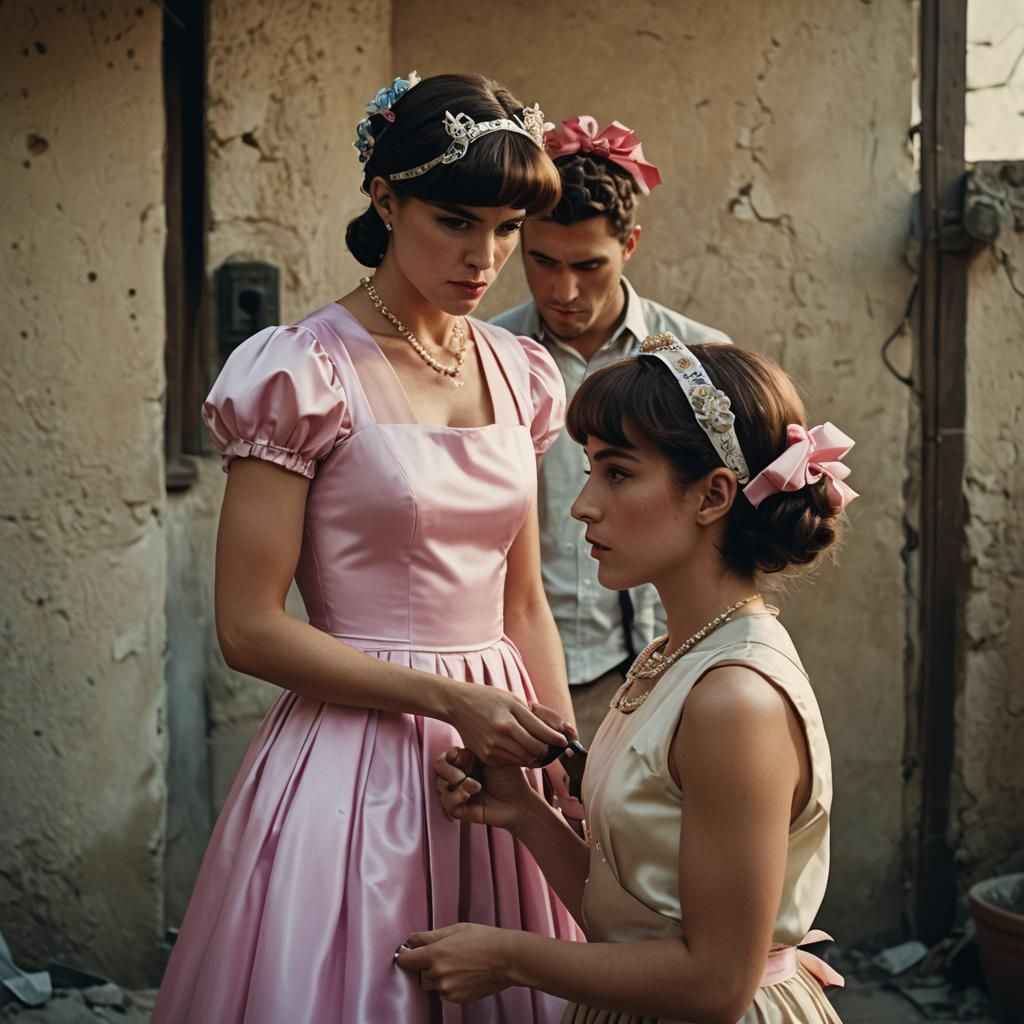 Cinematic film still of a muscular boy dressed in a quinceañera gown, with his girlfriend adjusting a ribbon on his head. Shot with film grain and dramatic lighting.