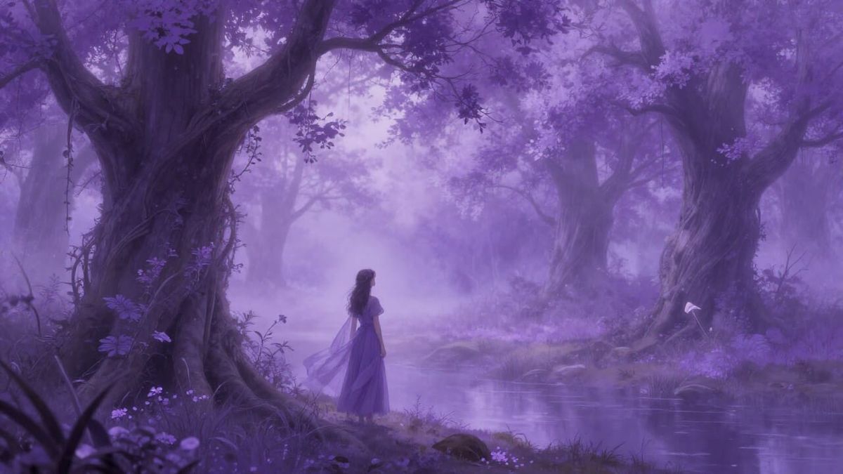 This image displays a hyperdetailed fantasy scene shrouded in ethereal mist, evoking a sense of opulent violet hues and dreamlike wonder.