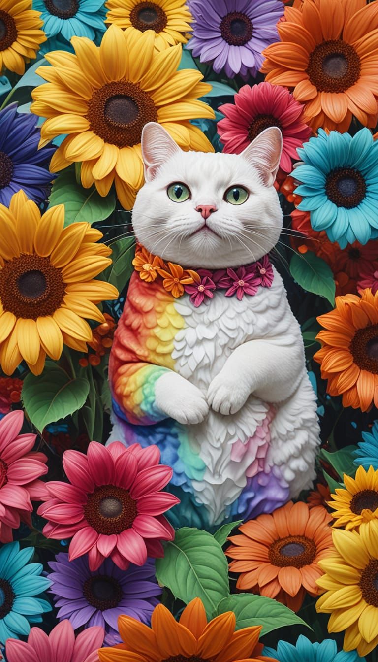 This image shows a vibrant and whimsical scene with flowers, a starry sky, and a melting snowman in a tie-dye rainbow background, blending surrealist and candy art styles with hyperrealistic details.