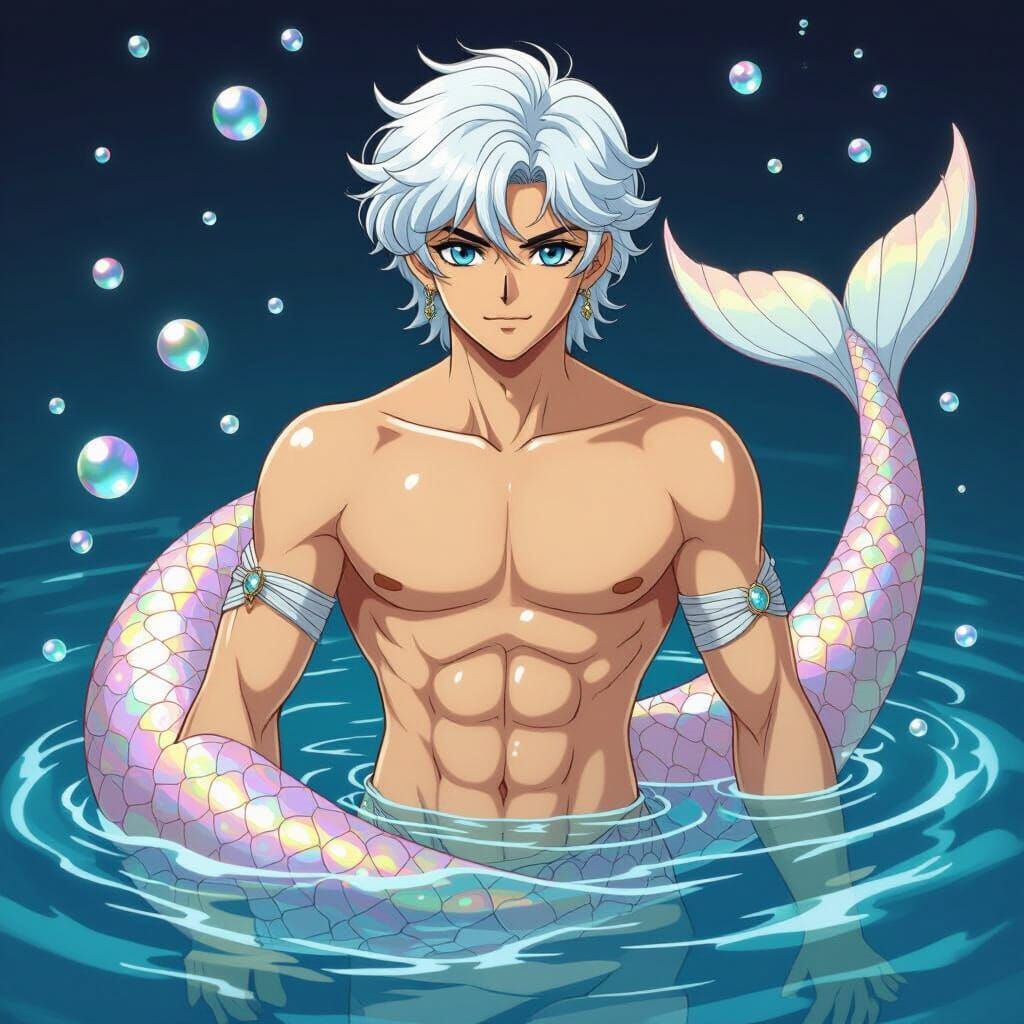 This fantasy illustration shows a detailed anime merman with white hair and blue eyes, swimming gracefully. His elegant torso connects to a shimmering, iridescent tail in a mystical aquatic setting.