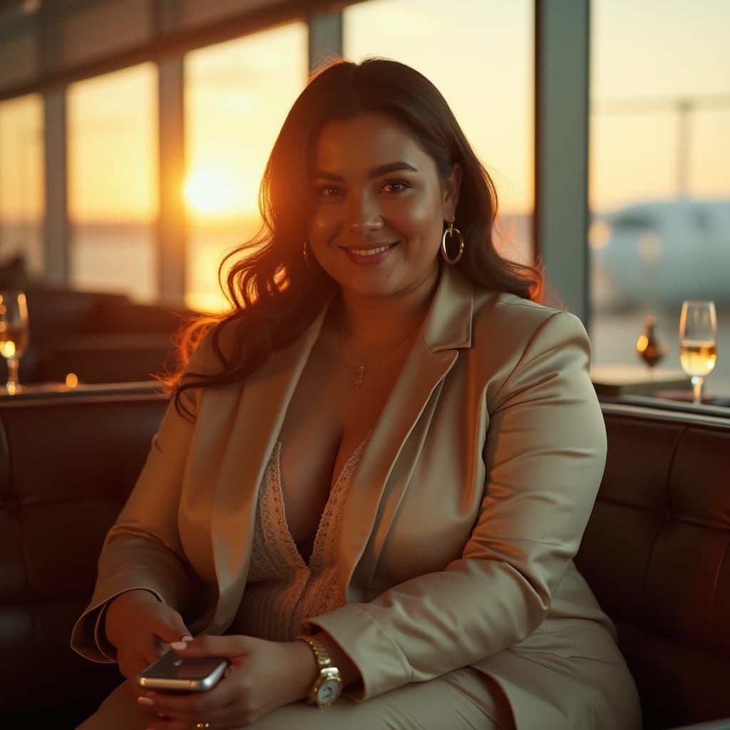 This image captures a poised woman in a sumptuous airport setting, exuding confidence and style, surrounded by opulence and subtle film grain. Her tailored suit, golden accessories, and champagne-colored blouse create a striking visual contrast, while the warm sunset light adds a cinematic touch.