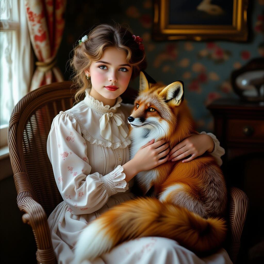 This cinematic film still captures a charming young lady from the early 20th century, demurely seated in a wicker chair and petting a red fox. Shot with a vintage film aesthetic, it features atmospheric lighting and rich color grading.