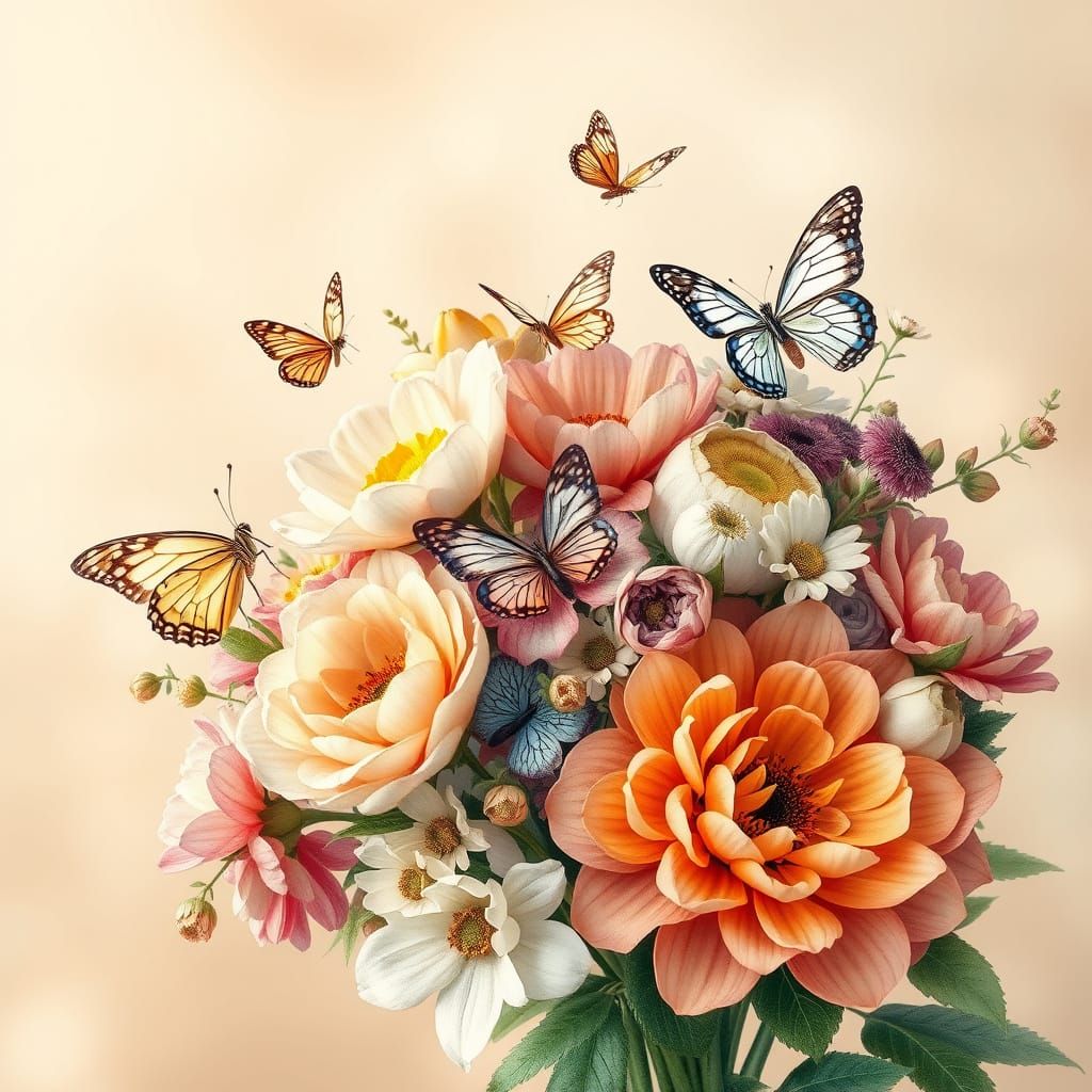 A close-up image showing a layered bouquet of flowers and butterflies. The sepia-toned image features warm, golden lighting, intricate details, and soft pastel colors in a whimsical watercolor style.