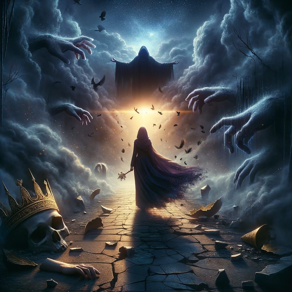 This image depicts a strong Middle Eastern woman walking alone down a dark, fractured path, surrounded by the remnants of her former power and manipulated past. A radiant light on the horizon hints at a brighter future.