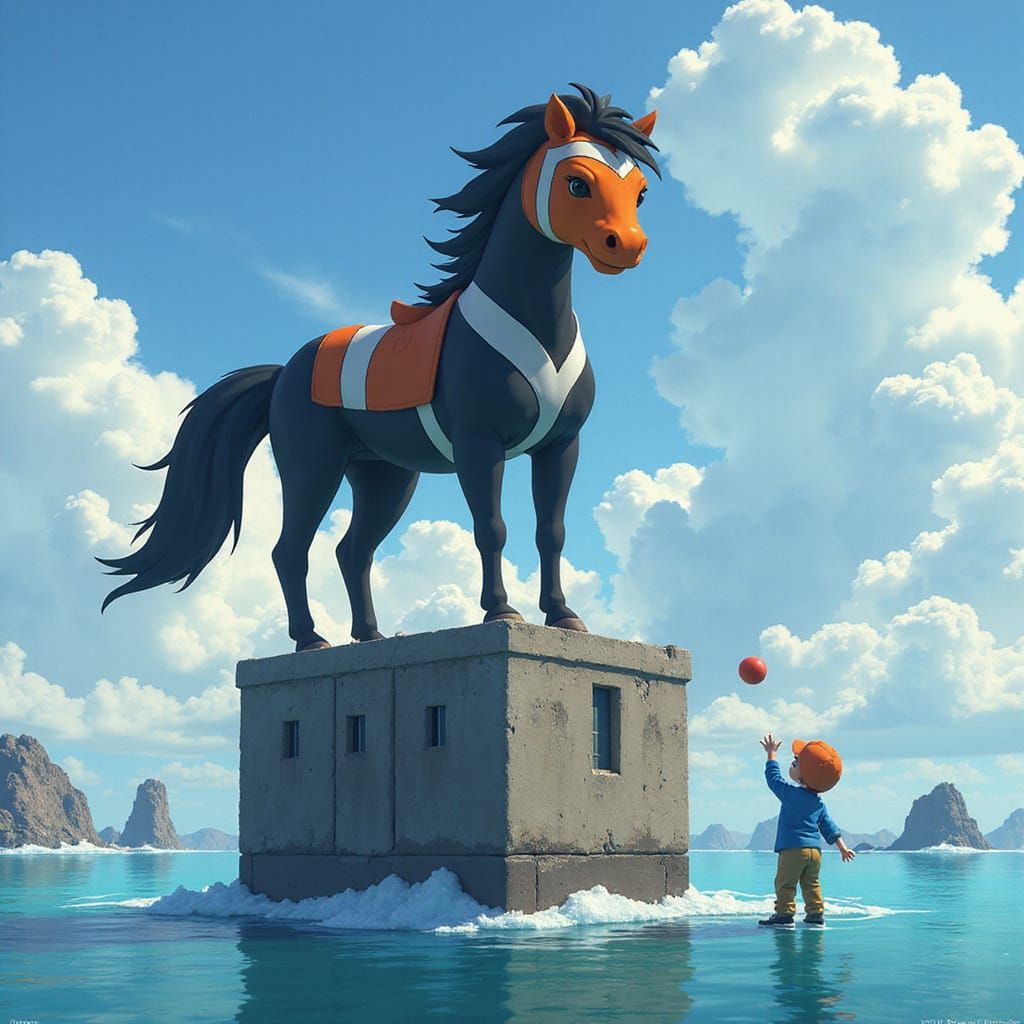 This image shows a new legendary fire and ice type Pokemon, a horse and clownfish hybrid, perched on a sunken skyscraper as a trainer throws a pokeball. The art is reminiscent of old school cartoon animation.