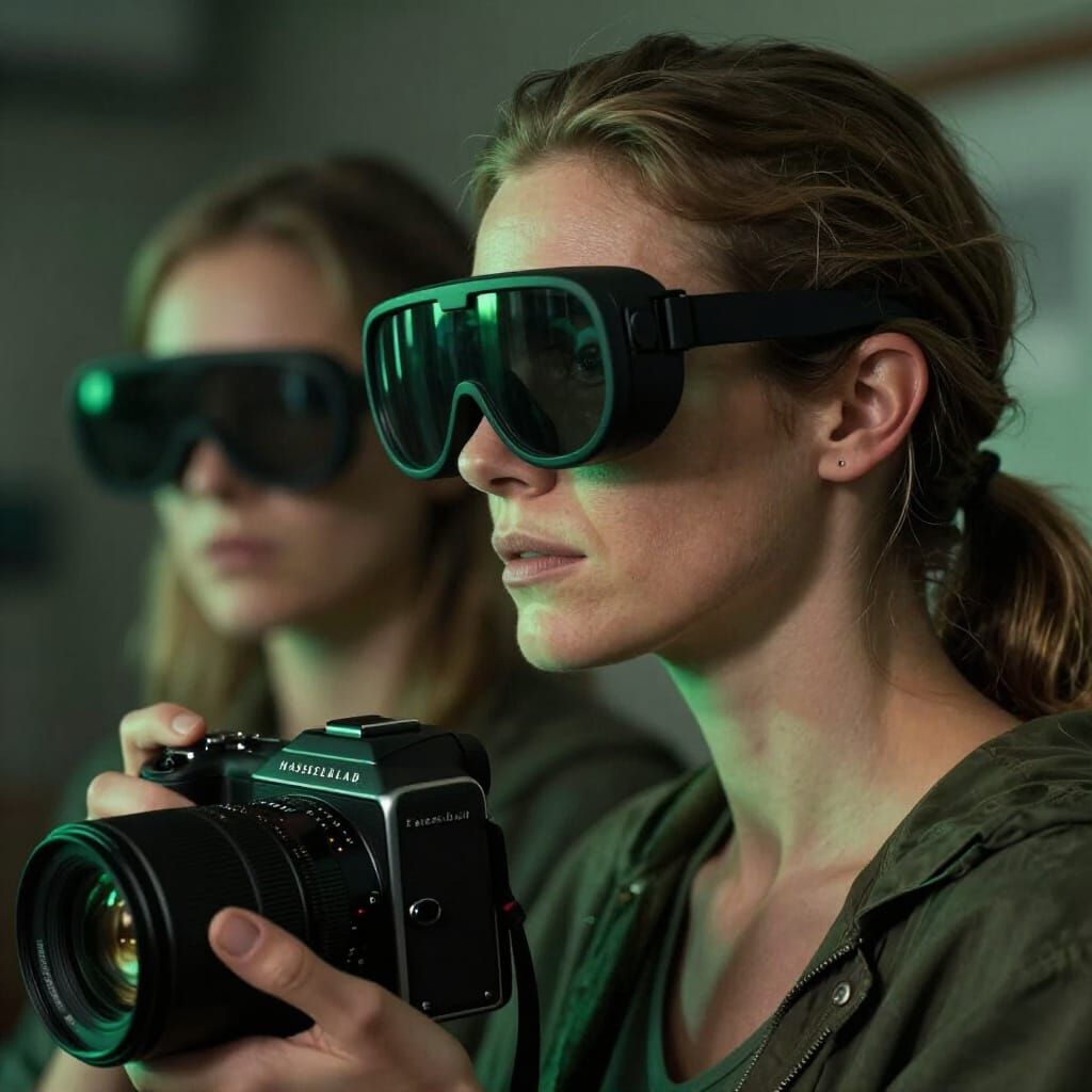 This hyperrealistic photo captures Mester Ágnes and Carrie-Anne Moss with futuristic cybernetic ear implants and vision helmets, bathed in cinematic green lighting.