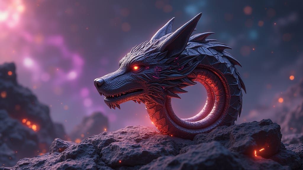 A striking picture of a mythical ring featuring a wolf-dragon head, crafted from cosmic metal with ruby veins. The ring is set against a backdrop of colliding stars and celestial shadows, in photorealistic fantasy art.