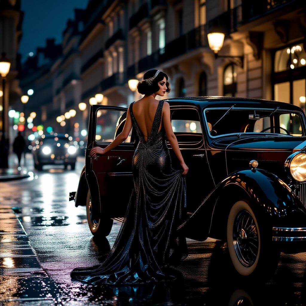 A hyperrealistic image shows an elegant woman in a 1920s gown exiting a vintage car on a rainy Parisian street. The cinematic lighting and dramatic shadows evoke vintage high-fashion photography.