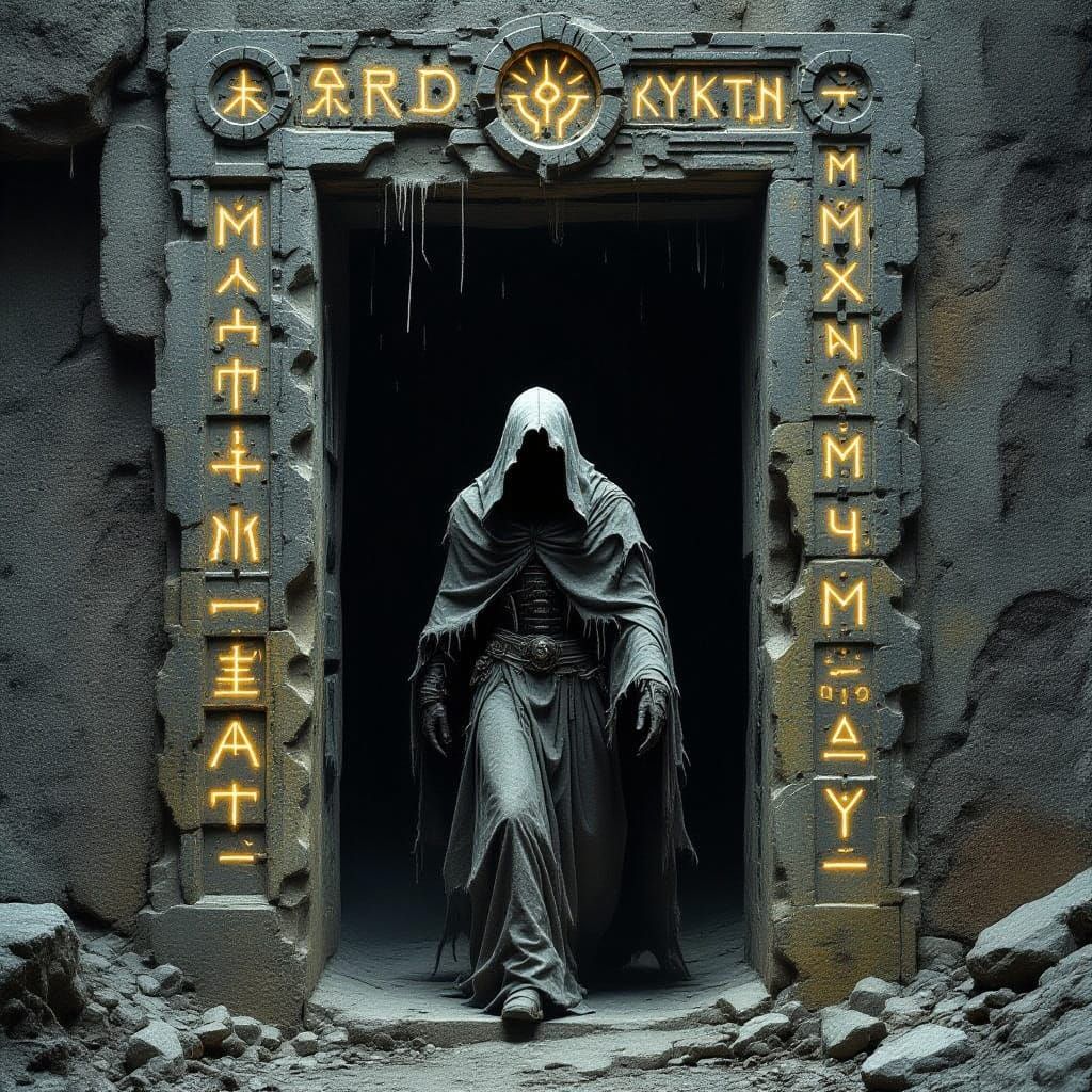 This image shows a grim figure emerging from a runic doorway. The scene evokes a biomechanical, dystopian, and surreal aesthetic, reminiscent of nightmarish landscapes.