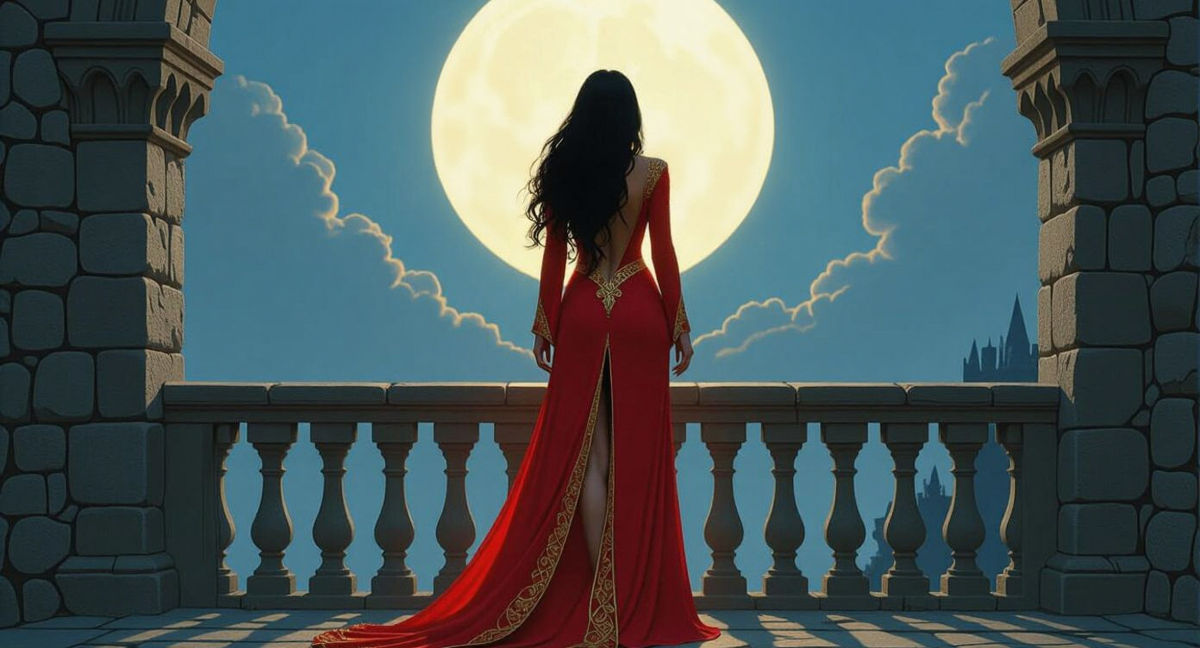 This image shows a statuesque woman with large fairy wings standing on a castle balcony. The moonlight illuminates her flowing black hair and red dress, with healed scars visible on her back.