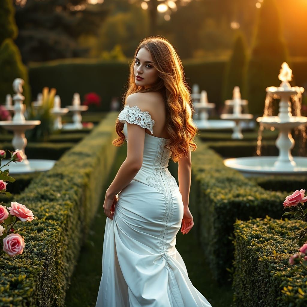A captivating image of a young Victorian queen strolling through a vibrant royal garden. She wears an elegant white gown and glances back with authority amidst roses, fountains, and the soft glow of golden-hour sunlight.