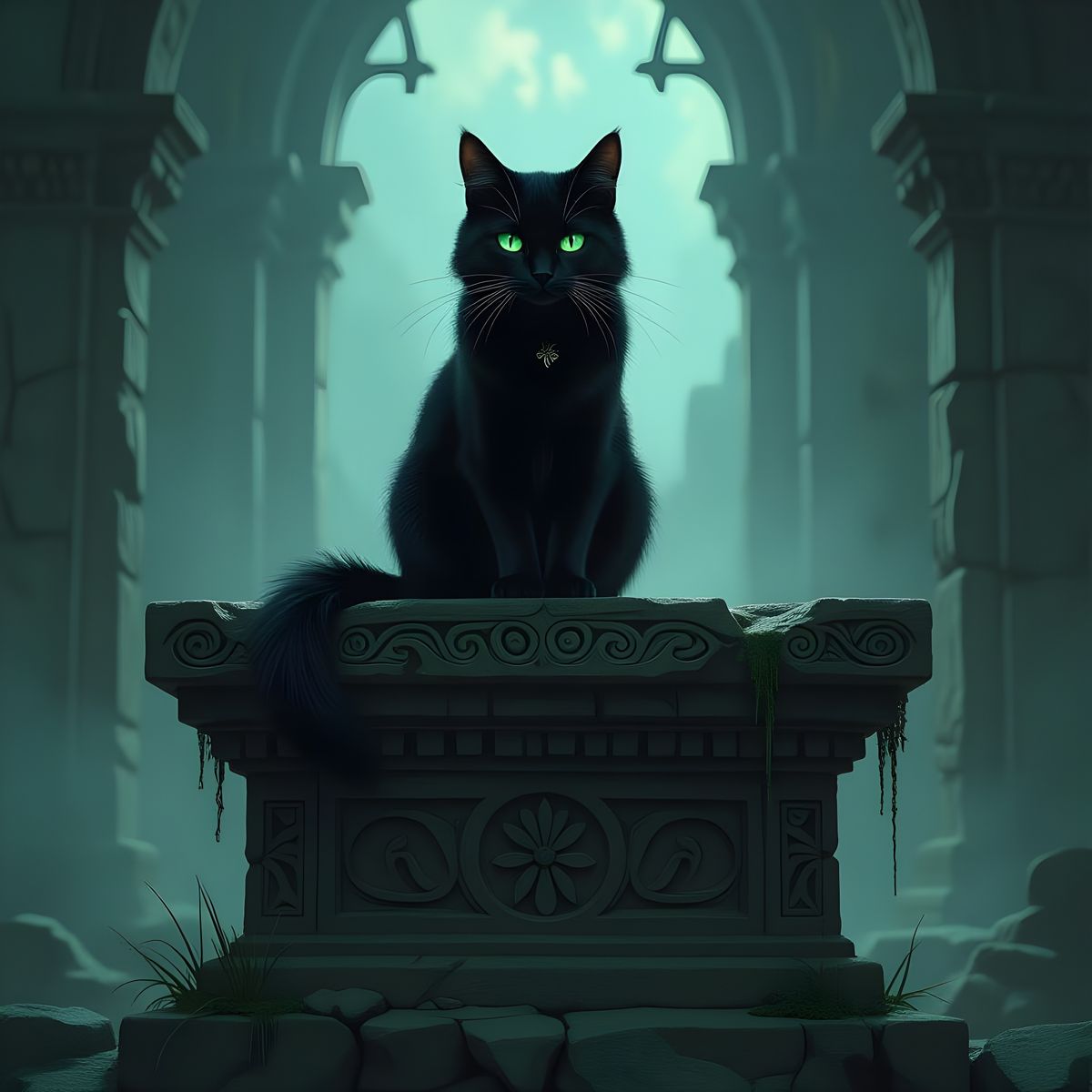 A striking image of a black cat with emerald eyes on an ancient altar, bathed in dramatic chiaroscuro lighting. Evokes a dark fantasy concept art mood with rich texture.