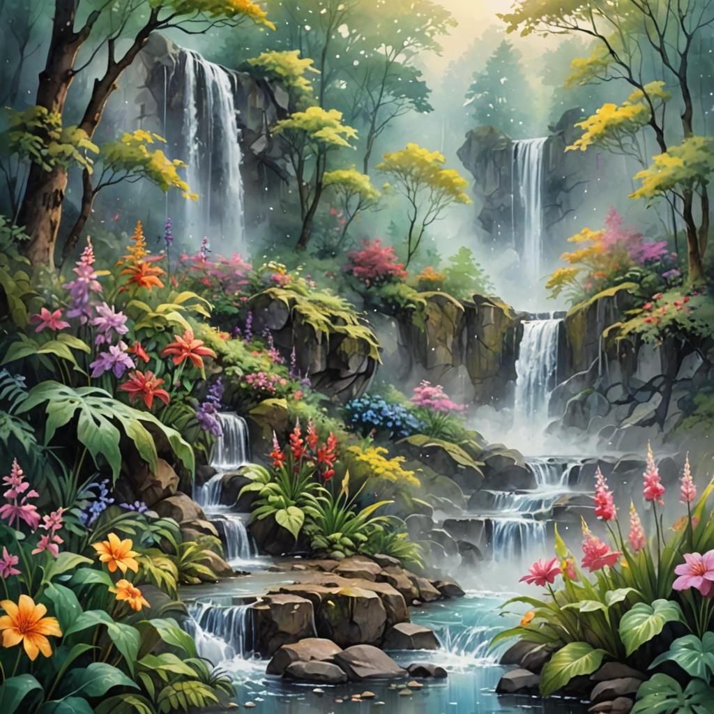 A vibrant image of a waterfall cascading through a lush forest, surrounded by colorful flowers and mist. The scene evokes a romantic and ethereal atmosphere, enhanced by realistic details and a beautiful color palette in a dry watercolor style.