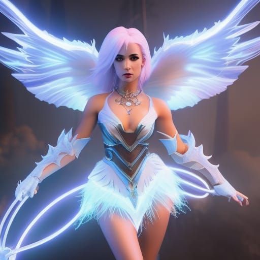 A digital rendering of a white-haired fairy with electric dress and translucent wings. The artwork showcases a fantasy aesthetic with intricate details, natural lighting, and complementary colors, reminiscent of anime key visuals.