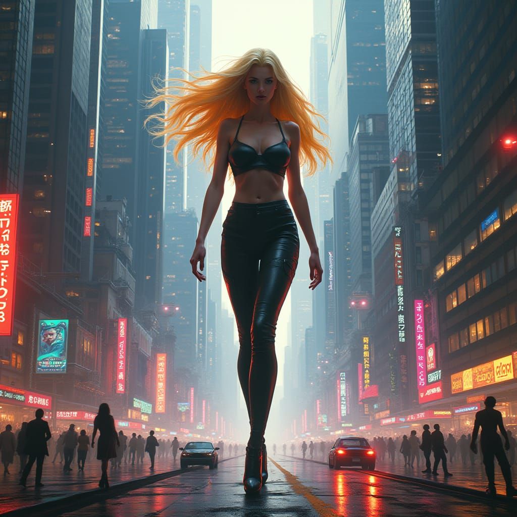 A powerful blonde woman strides through a futuristic city, dwarfing the skyscrapers with her colossal frame. Vibrant neon lights reflect off glass facades, casting a kaleidoscope of colors across the bustling streets.