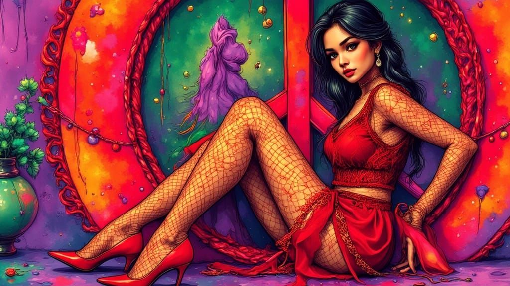 <lora:Cute Anime:1.0> <lora:WatercolorSketchFx:1.0> Woman, mid-20s, light-brown skin, sits in a peace symbol. Red, see-through mesh top, orange fishnet stockings, and red high heels. Subtle, contemplative expression, slightly pensive gaze directed downwards. Relaxed body language, legs crossed. Composition ...