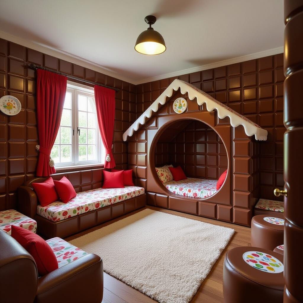 This image shows a child's bedroom constructed entirely from chocolate. The walls, furniture, and accessories are all rendered in various shades of brown, creating a whimsical scene.