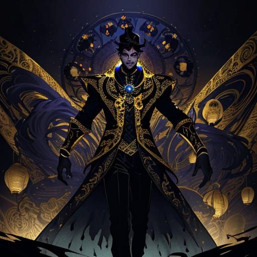 This captivating image depicts enigmatic men in ornate attire surrounded by a whirlwind of luminescent lights and mist, set against a rich black background, with golden accents and glowing lanterns, reminiscent of a mystical carnival at dusk, in a style that blends fantastical and dreamlike qualities wit...