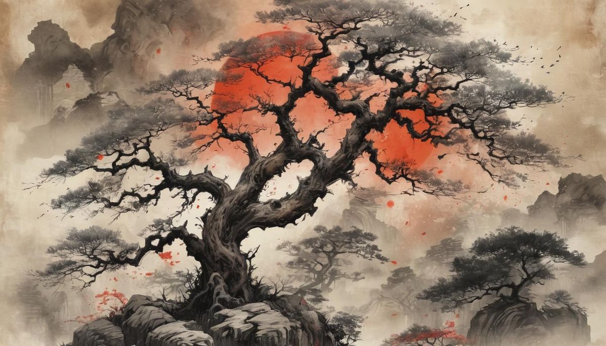 A detailed illustration of a fierce, immense, old tree under a red sun. The image has muted colors and a rice paper texture, rendered as a Chinese ink painting with vibrant vector elements.