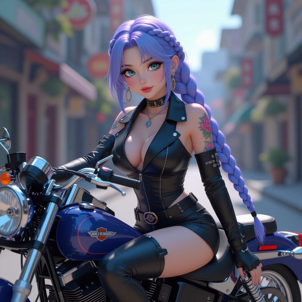 This image shows a woman with braided hair, shaved on one side, sitting on a vintage motorcycle. The subject is wearing a black leather outfit and has blue-green eyes, rendered in a detailed 3D anime style.