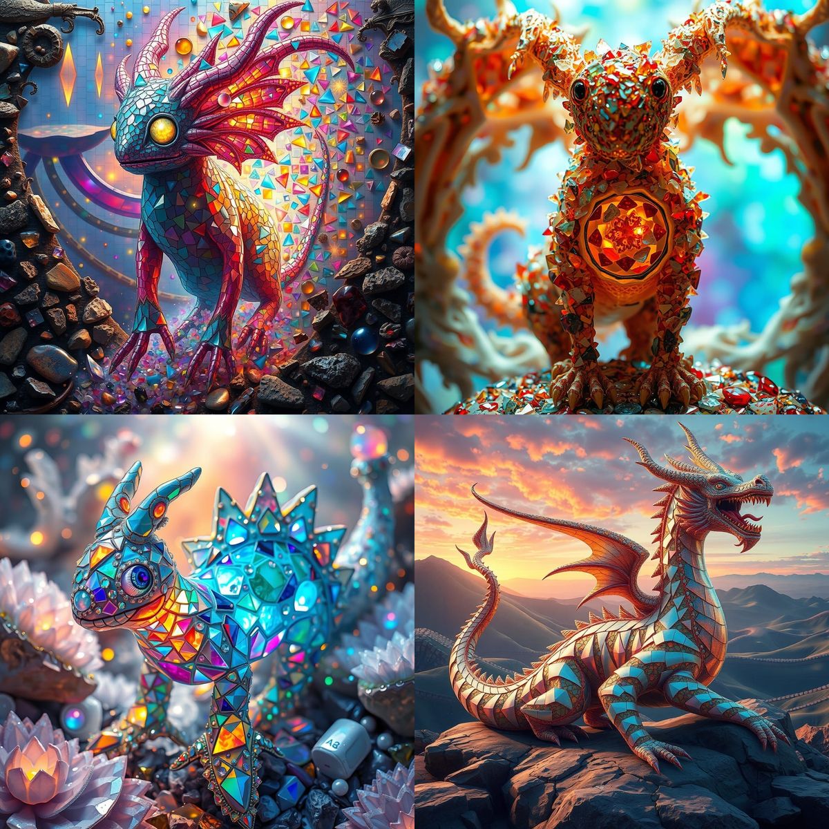 A vibrant fantasy creature brought to life through an intricate mosaic of colorful tiles reflecting light.