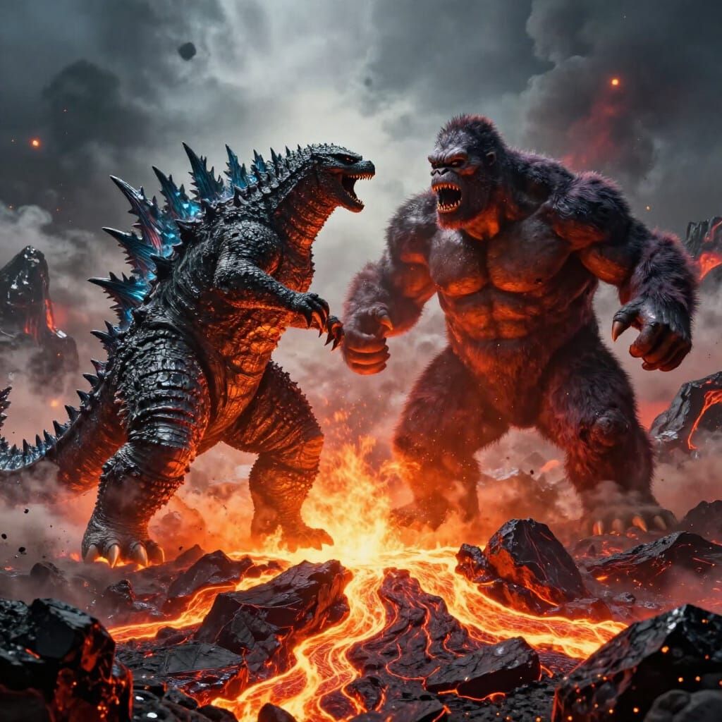 A colossal Godzilla and King Kong clash amidst a fiery volcano. This digital matte painting captures their intense fight with dramatic lava backlighting and a vibrant, fiery palette.