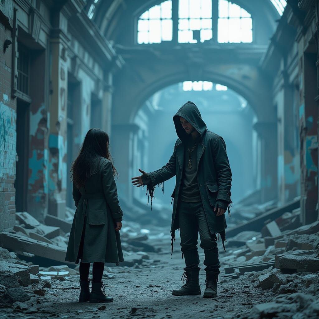 A gritty image of a young man in a hooded cloak cautiously approaching a woman amidst the ruins of a station. The scene features muted colors, dramatic lighting, and a dark, futuristic aesthetic.