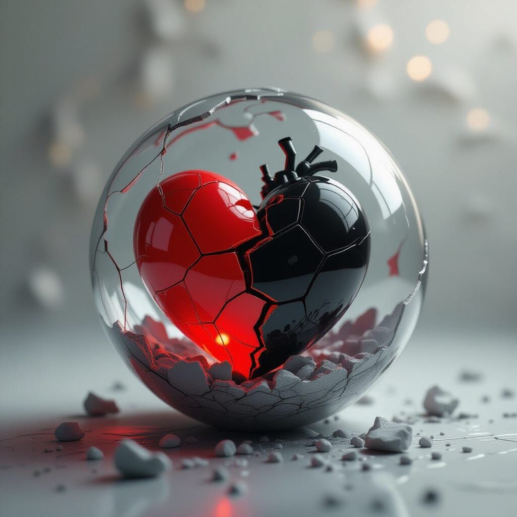 A surreal image shows a fragile glass orb containing a heart, split between vibrant red and stark black, that is breaking apart. The scene is rendered with ethereal lighting and textures.