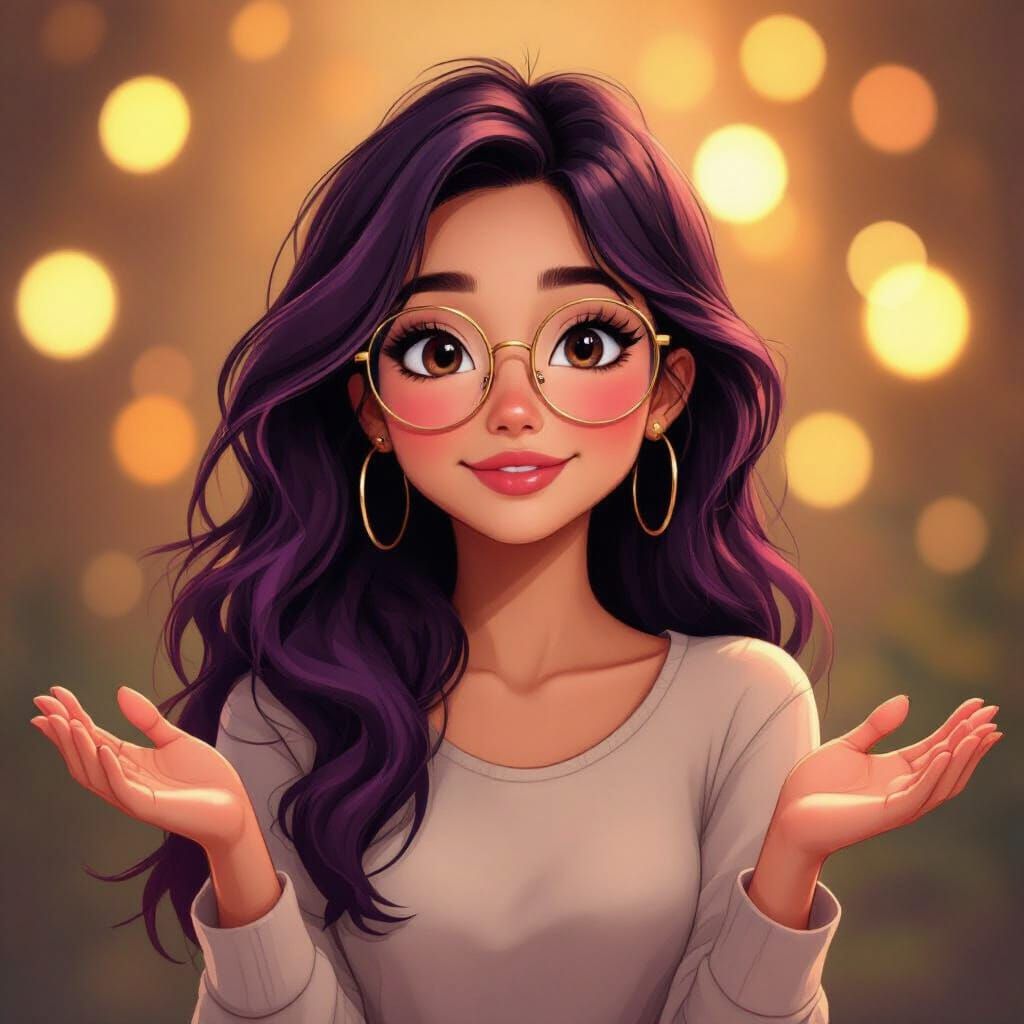 This image shows a young woman with purple hair and glasses, offering a gentle hug. The digital illustration features vibrant, dreamy colors and soft lighting for a warm, inviting feel.