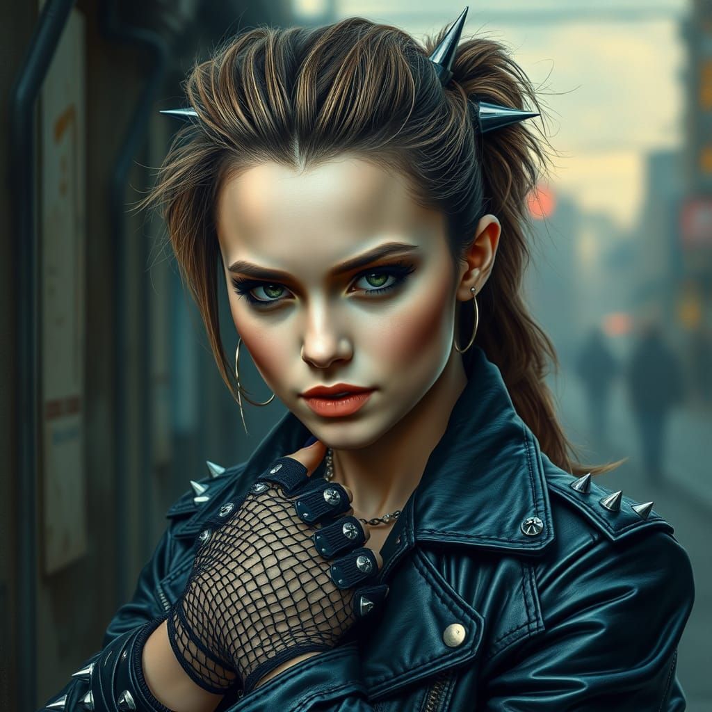 This image depicts a young woman with an enigmatic smile, reimagined as a punk rock icon in a futuristic, urban setting with a cyberpunk aesthetic, complete with metallic spikes, ripped gloves, and a bold hairstyle.