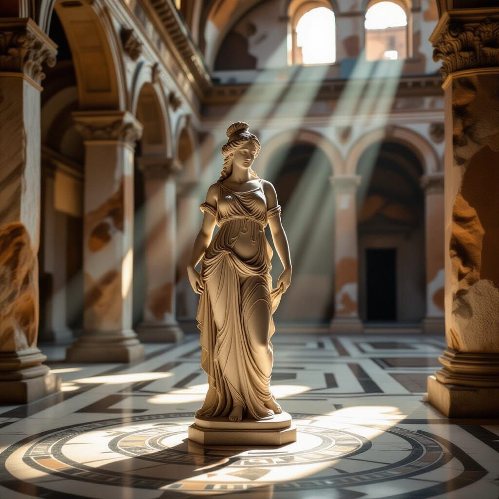 This photorealistic image captures a sculpted marble statue of Venus in ancient, crumbling temple ruins. Sunlight illuminates the scene, creating dramatic shadows and highlighting forgotten grandeur.