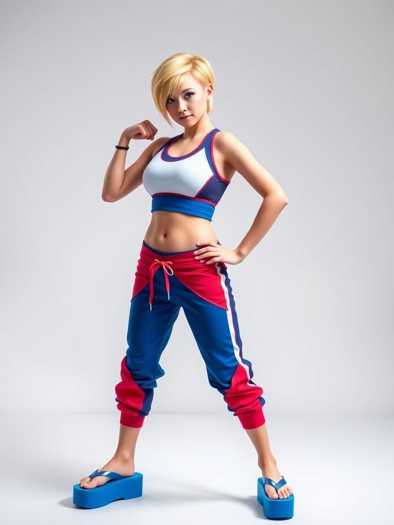 A realistic cosplay photo of Blue Mary from King of Fighters. She has short blonde hair and wears a modernized, cropped athletic outfit with tall blue platform flip-flops against a studio background.