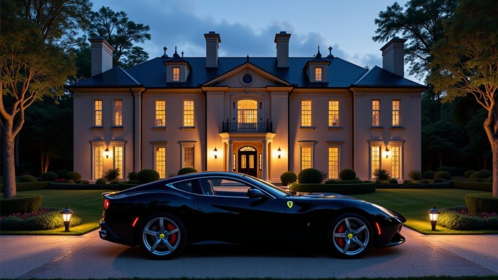 This image shows a sleek black Ferrari 250 GTO parked before an elegant baroque country estate at twilight. Cinematic digital painting style with dramatic lighting.