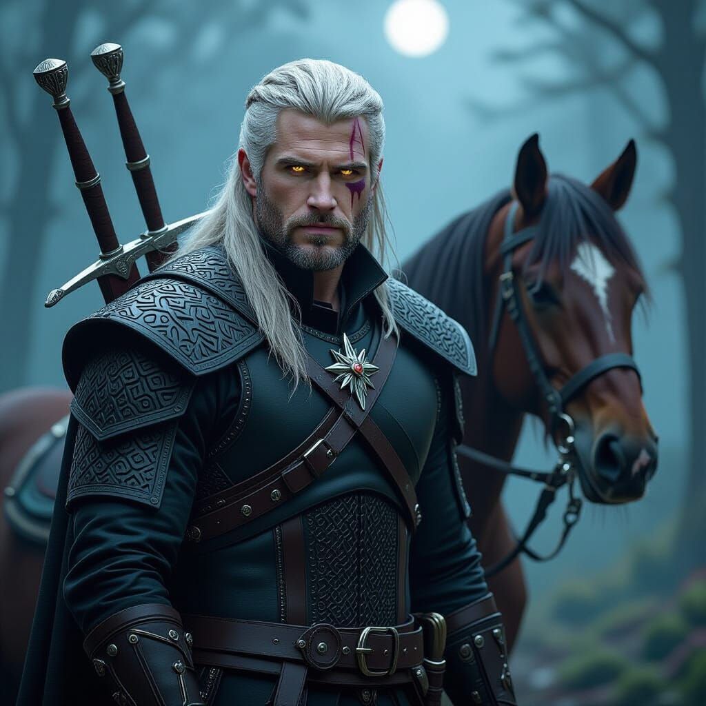 A digital painting shows Geralt of Rivia, portrayed with white hair and gold eyes, in dark leather armor. He stands with his horse Roach in a misty forest, wielding Witcher swords in a dark fantasy style.