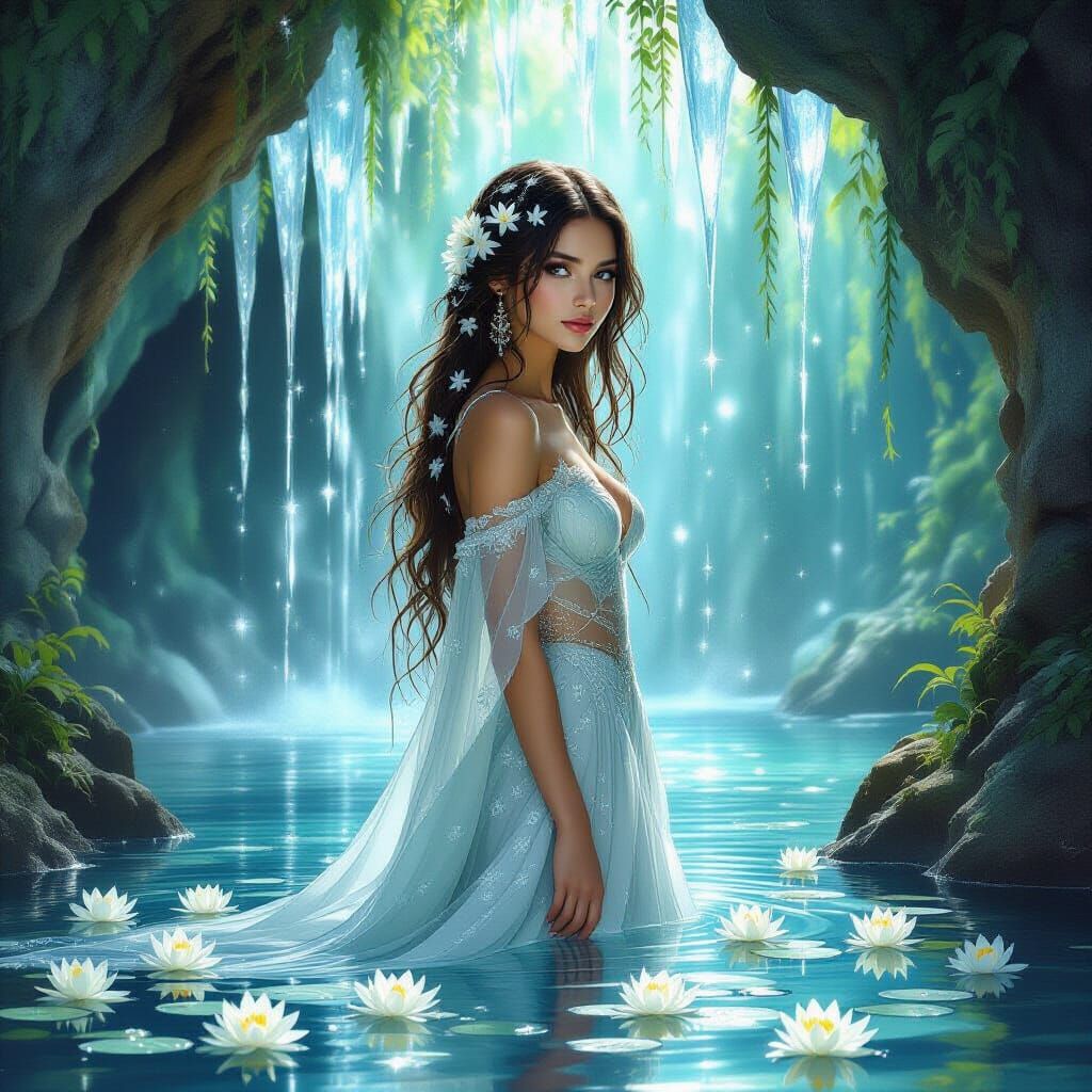 A captivating image of a woman with waterfall hair, lily adornments, and a seashell gown, standing in a crystal-filled grotto. The image showcases the elegance of art nouveau.