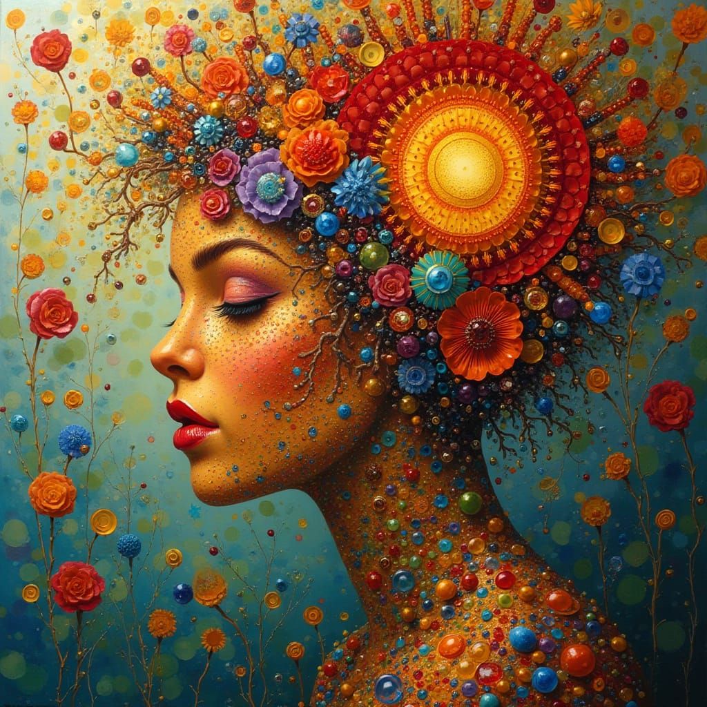 Glasswork woman cocophony of RADIANT ⭐️🌜SUNBEAMS SATURATION 🍩 GARLAND, in the style of Salvador Dali 🦪