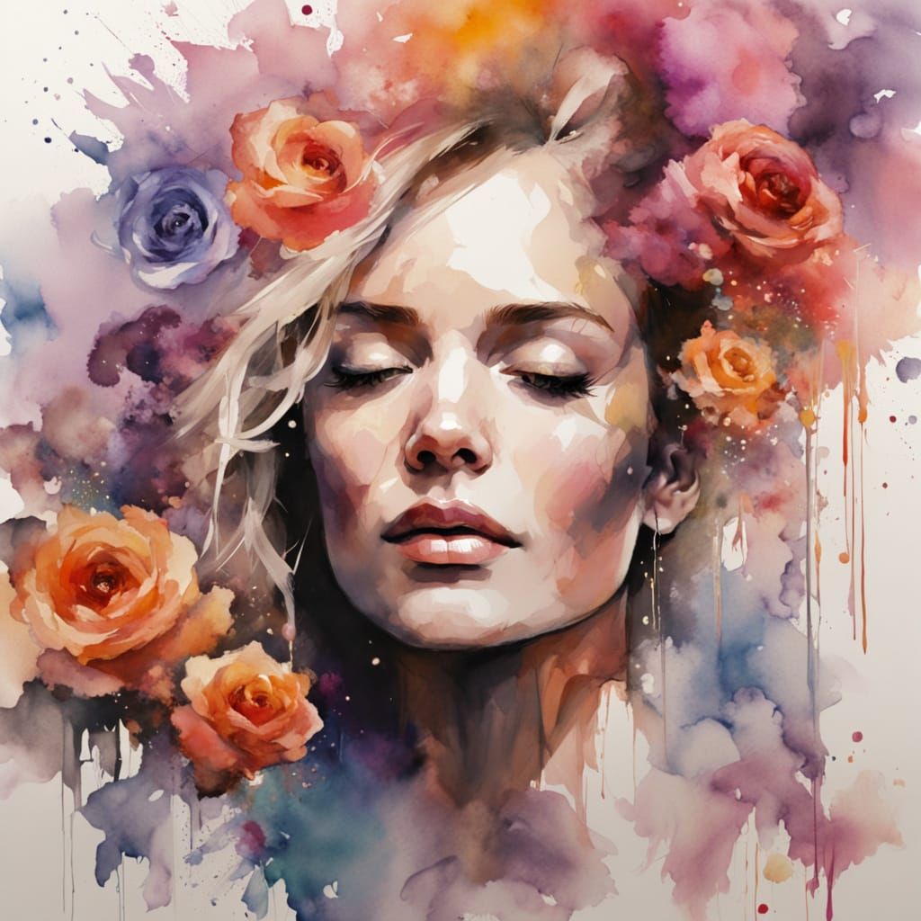 This image shows a stunning portrait of a woman composed of roses. The artwork features a blend of watercolour techniques and cinematic stylization, creating a mesmerizing fusion of beauty.
