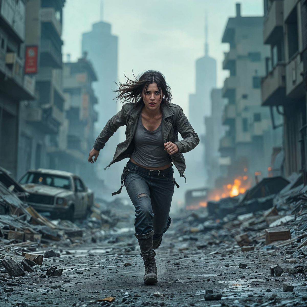 This image shows a woman running through a ruined cityscape. The scene evokes a sense of urgency and despair, depicting a world ravaged by a cataclysmic event.